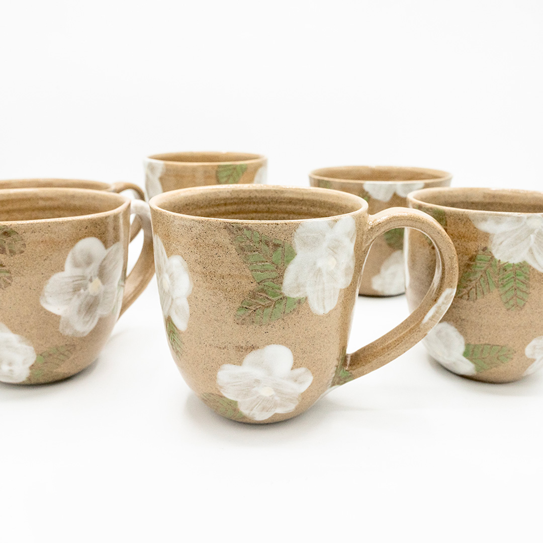 Réalisation : La base de la tasse est créée au tour de potier. Chaque tasse est ensuite décorée à la mains et les feuilles sont ensuite gravées.